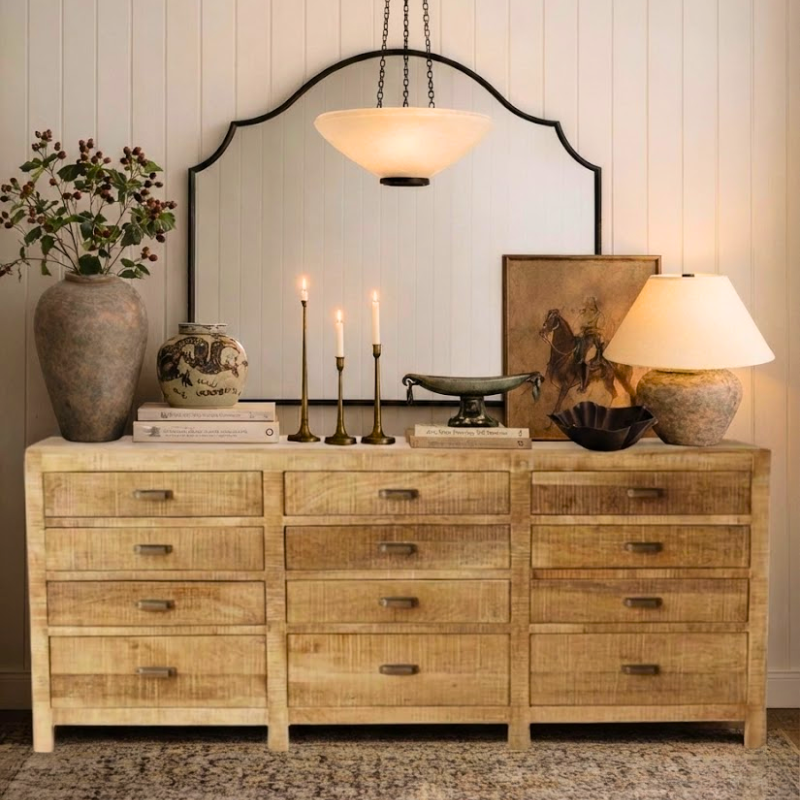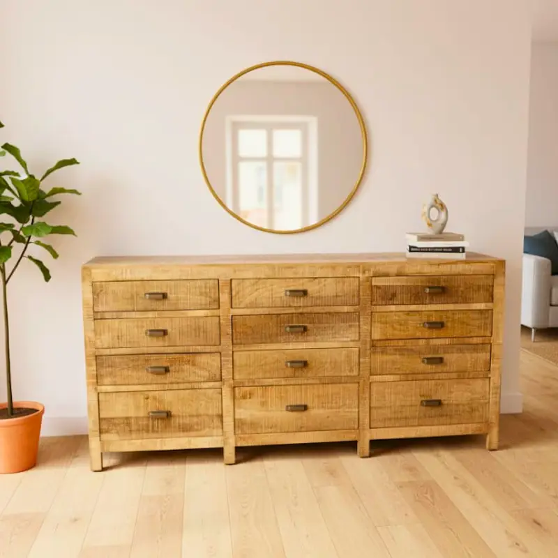 Bring timeless warmth and effortless style to your home with our Handcrafted Wooden Chester Drawers, designed for modern Indian homes that love a touch of rustic charm. Made from premium oak wood and finished in a soothing Natural Wood Finish, this spacious console blends durability with minimalist elegance. Whether used as a living room console, or hallway storage, its clean lines and handcrafted detailing elevate any space. A perfect balance of Rustic Modern aesthetics and thoughtful functionality, this dresser adds character, storage, and style to contemporary homes.