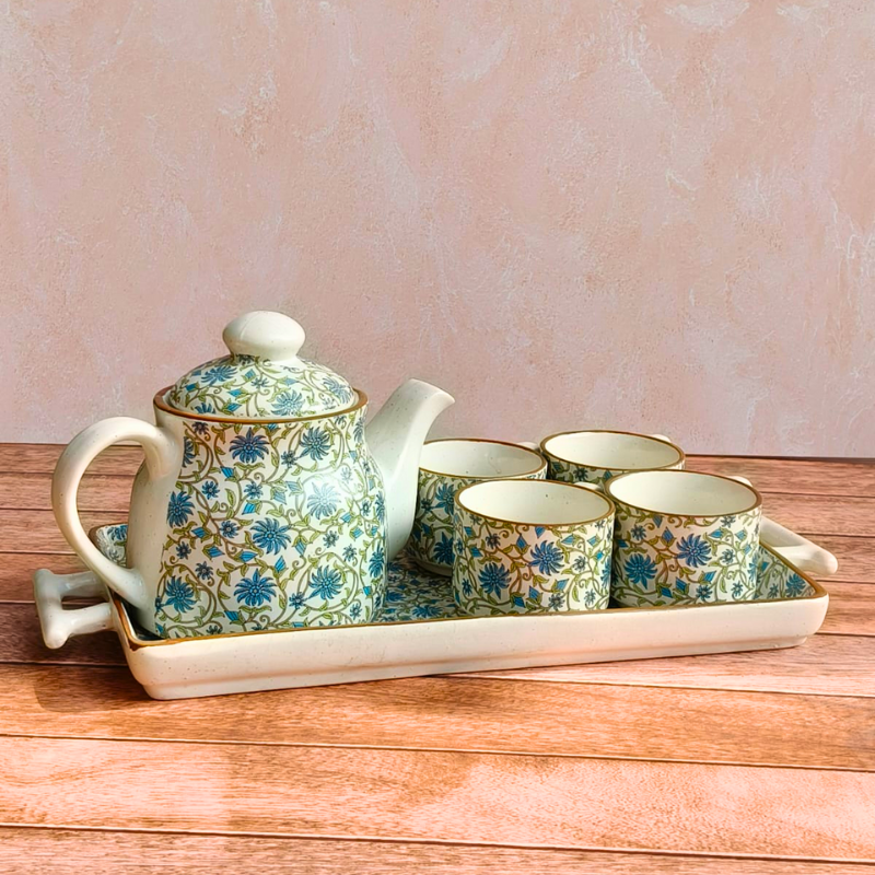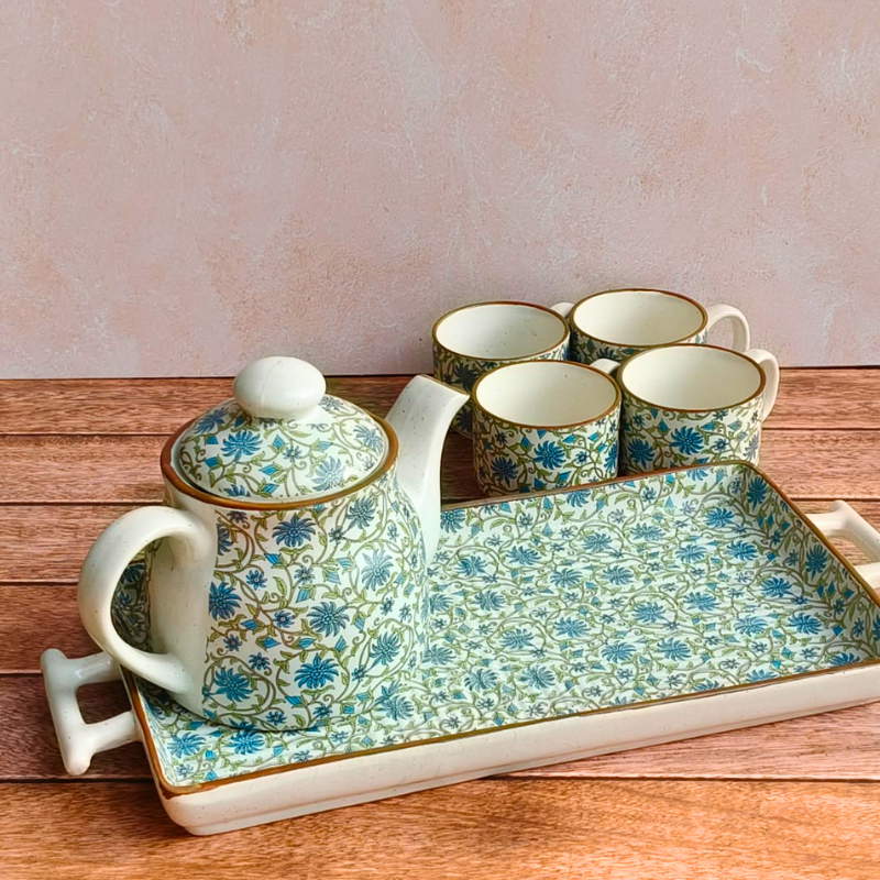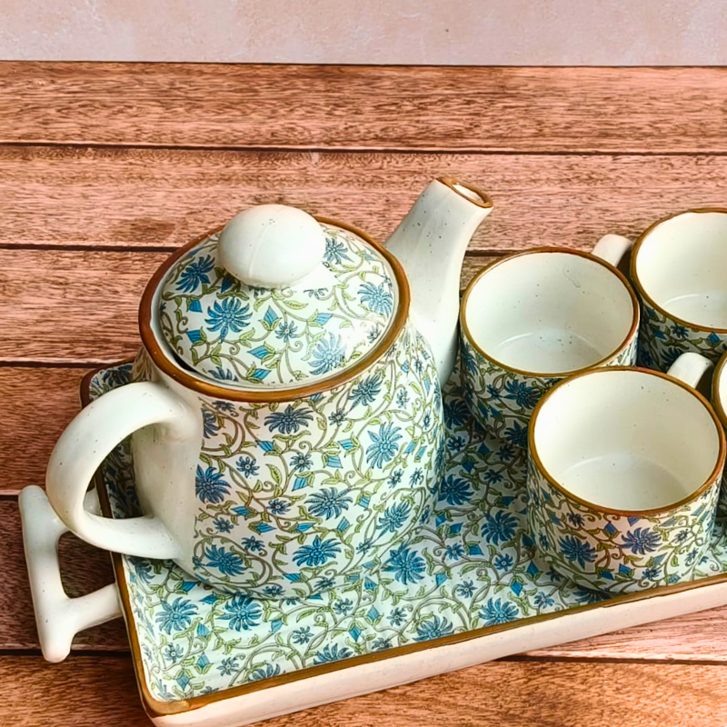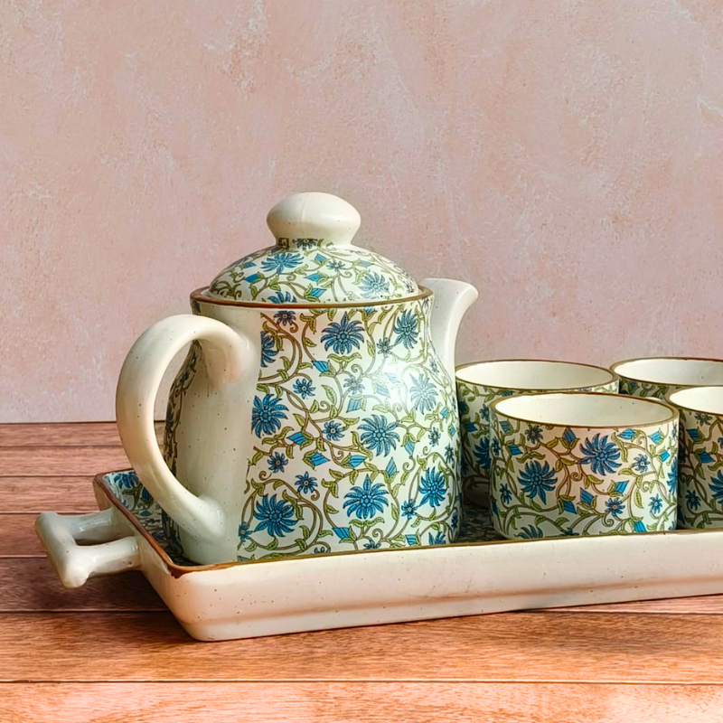 Bring home the charm of slow, mindful tea rituals with our Ceramic Green Floral Tea Cup Kettle Set. Handcrafted in stoneware ceramic, this elegant set features a delicate green floral motif inspired by nature and traditional Indian artistry. Perfect for everyday use or thoughtful gifting, the set includes a beautifully shaped kettle, matching tea cups, and a coordinating tray. Durable, heat-retaining, and visually soothing, this Pinterest-worthy tea set elevates your table while celebrating handmade craftsmanship. Ideal for aesthetic lovers who cherish calm mornings, cozy evenings, and handcrafted ceramic pieces made with care in India.