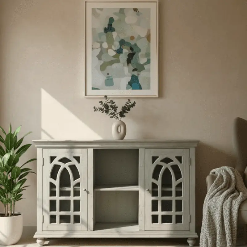 Elevate your home styling with our Handcrafted Wooden Cabinet, beautifully finished in a Distressed Gray Wash. Made from premium oak wood, this spacious console features elegant arched cabinet doors, decorative glass panels, and open center shelving for functional charm. Its rustic yet refined design blends seamlessly into living rooms, hallways, dining areas, or entryways. Handmade in India by skilled artisans, this durable console brings warmth, character, and timeless style to modern homes. Perfect for displaying décor, storing essentials, and enhancing your interior with artisanal craftsmanship.