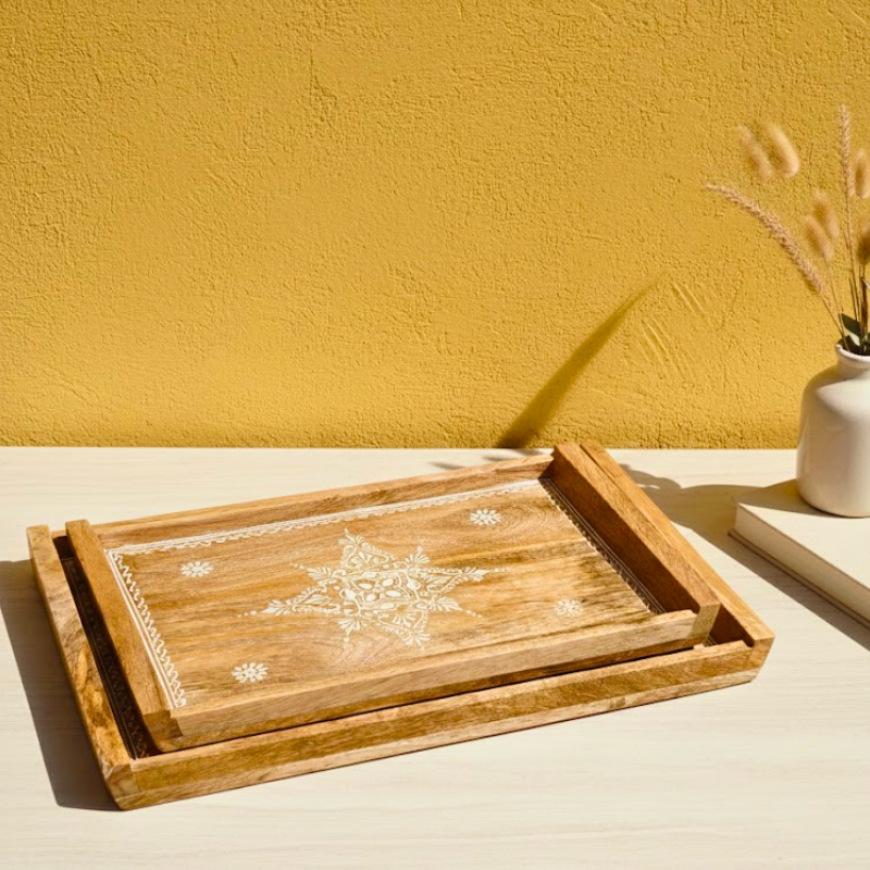 Bring home a piece of India’s living craft tradition with our handcrafted wooden Lippan art rectangle tray. Thoughtfully made by skilled artisans, this tray blends rustic mango wood with intricate Lippan art detailing, creating a perfect balance of modern minimalism and festive charm. Sturdy, sustainable, and visually striking, it works beautifully for serving, styling, or gifting. Whether placed on a coffee table, dining setup, or console, this artisan-made tray adds warmth, texture, and cultural elegance to everyday spaces. Handmade in India, it celebrates craftsmanship, mindful living, and timeless design.