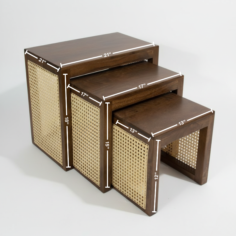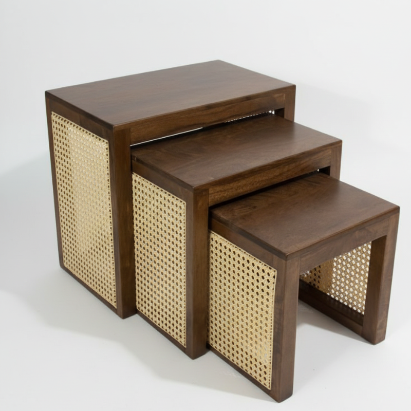Elevate your space with our Handcrafted Wooden Nesting Table, a perfect blend of natural elegance and everyday functionality. Made from premium Akashiya wood and detailed with handwoven rattan cane panels, this Pinterest-worthy nesting table set brings an earthy vibe to any living room, bedroom, or veranda. Use them together for a layered look or separately as side tables, plant stands, or accent pieces. Durable, lightweight, and versatile, these tables are thoughtfully handmade in India to add warmth and character to modern and boho-inspired interiors alike.