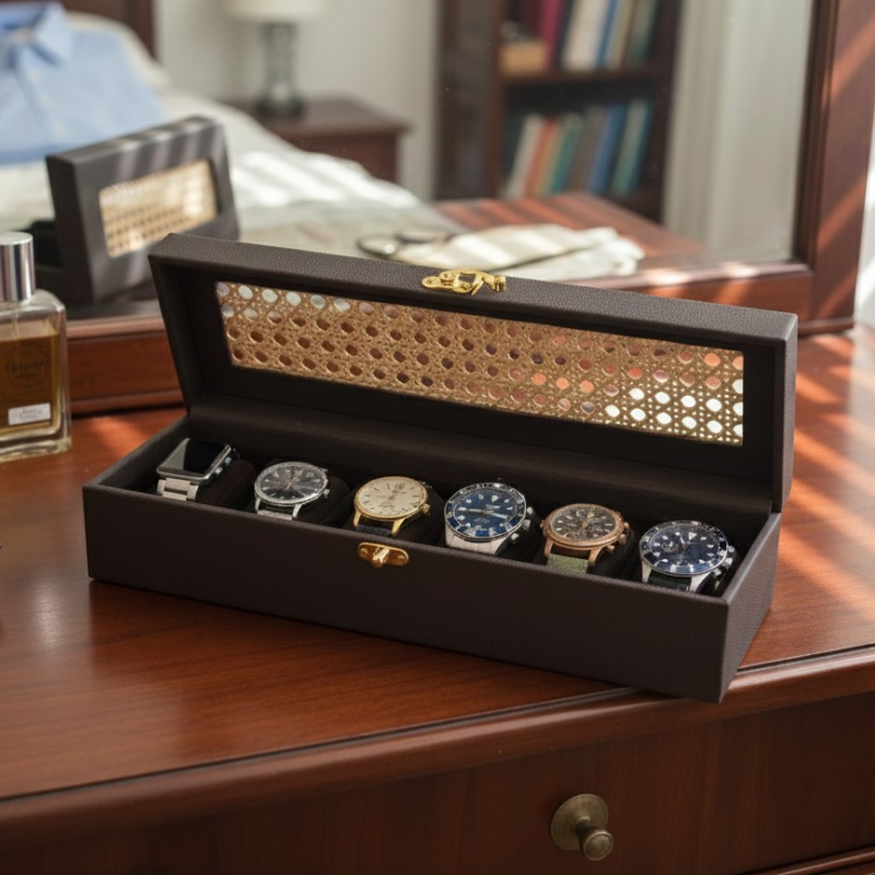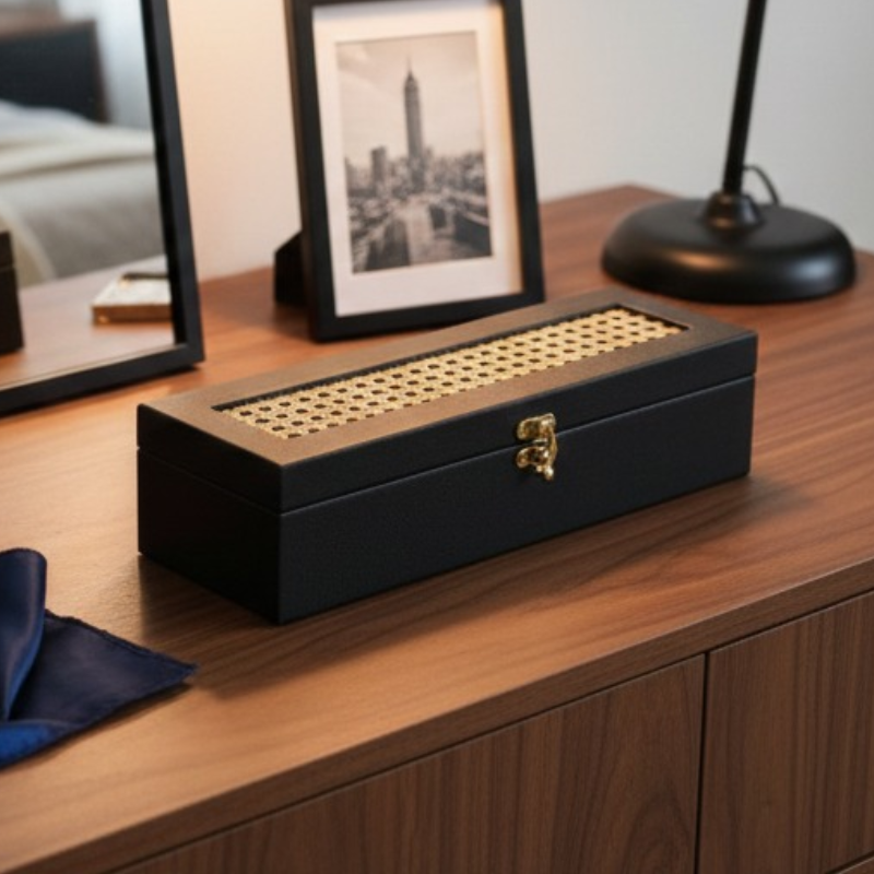 Elevate your everyday essentials with our Rattan & PU Leather Watch Case, thoughtfully designed for watch lovers who value style and organization. Handcrafted with natural rattan and finished in premium PU leather, this watch box blends timeless craftsmanship with modern elegance. Spacious yet compact, it securely stores multiple watches while adding a Pinterest-worthy accent to your dresser or wardrobe. Durable, lightweight, and beautifully detailed, this handcrafted watch case is perfect for everyday use or thoughtful gifting. Handmade in India, it’s a refined storage solution that keeps your timepieces protected and impeccably displayed.
