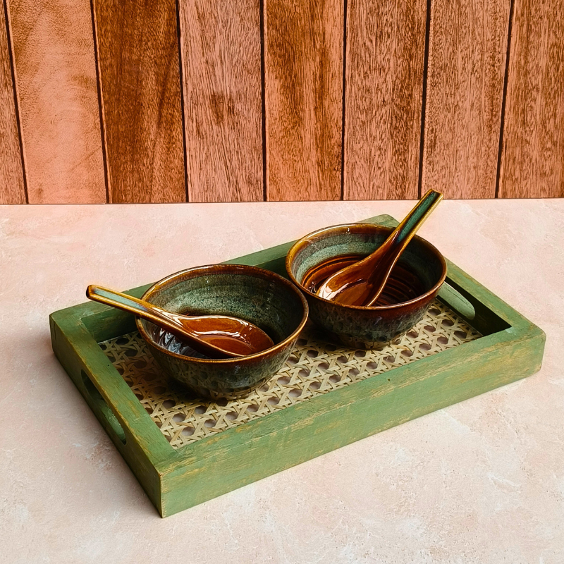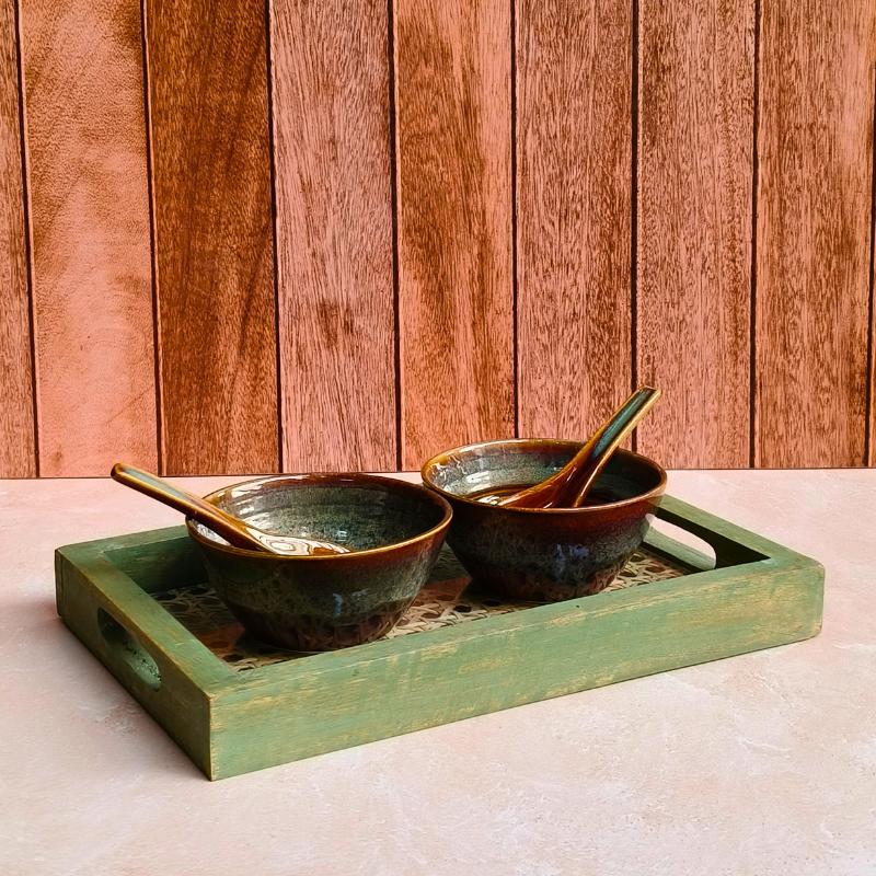 - Handcrafted ceramic bowl with matching spoon.