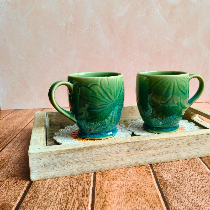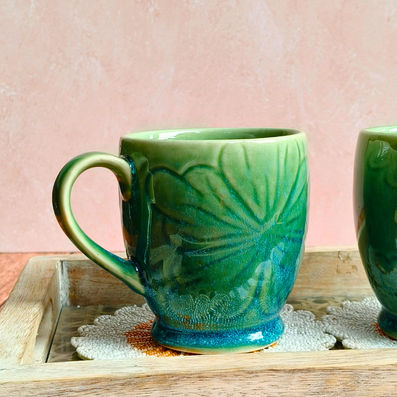 Add a touch of Pinterest-worthy charm to your daily coffee ritual with our Turquoise Floral Mug. Beautifully crafted using handcrafted ceramics, this triple-fired floral coffee mug blends durability with delicate design. The soothing mint glaze and embossed floral detailing make it ideal for both everyday use and thoughtful gifting. It’s perfect for coffee, tea, or hot chocolate. Handmade in India, this mug reflects artisan craftsmanship, making it a stylish essential for aesthetic lovers and home styling enthusiasts alike.