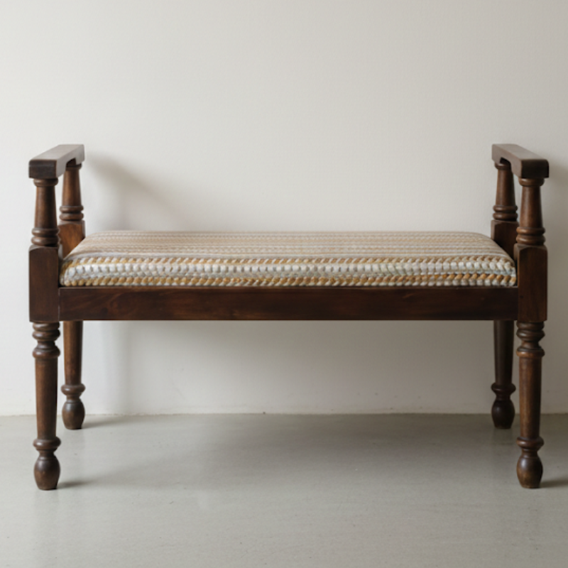 Add timeless charm to your home with our Handcrafted Wooden Bench with Armrest, designed to blend comfort with artisanal beauty. Made from sturdy mango wood and topped with a plush cotton gaddi featuring elegant tufting, this bench brings an earthy, Pinterest-worthy vibe to any space. Perfect for the bedroom, living room, entryway, or reading nook, it offers both style and everyday functionality. The warm wooden finish and hand-stitched upholstery reflect skilled Indian craftsmanship, making it a durable and aesthetic addition to modern or boho interiors. Handmade in India, this bench is where comfort meets conscious design.