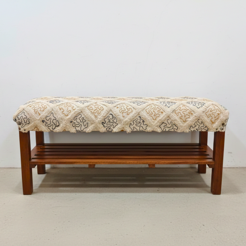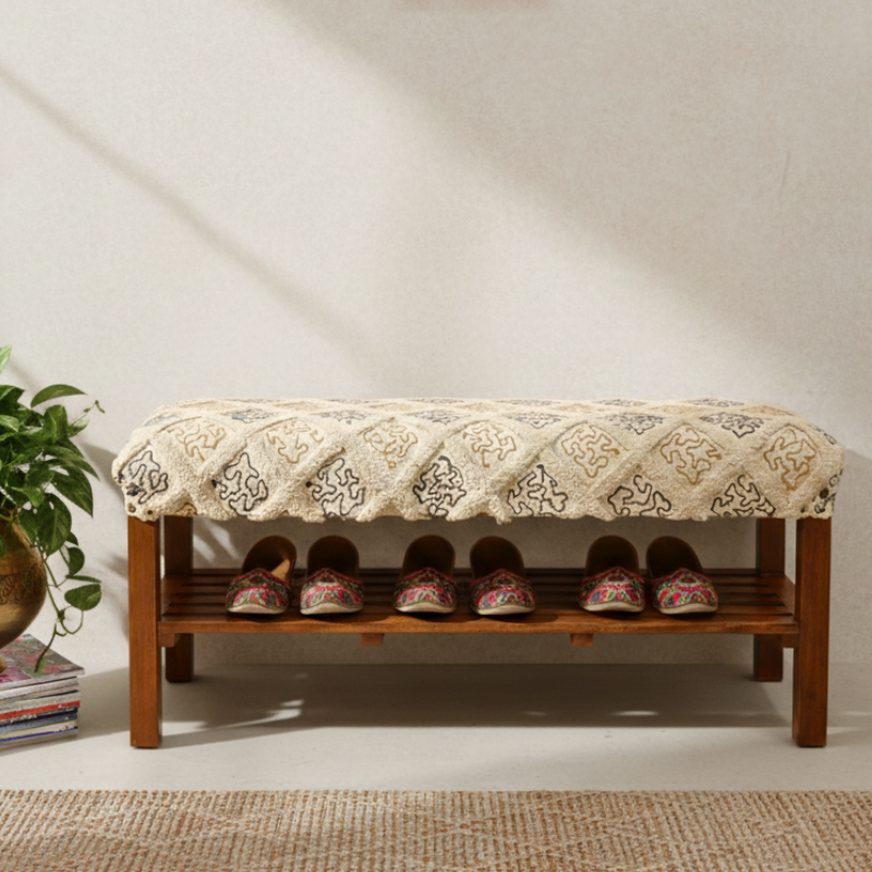 Bring warmth and functionality to your entryway with our Handcrafted Wooden Shoe Bench. Made from solid mango wood and topped with a soft cotton gaddi featuring elegant tufting, this bench blends comfort with timeless style. Designed to keep your footwear organized while offering a cozy seat, it’s perfect for bedrooms, hallways, or entryways. The earthy tones and Pinterest-worthy design make it a standout accent for modern Indian homes. Durable, sustainable, and handmade in India, this shoe bench is a beautiful balance of utility and aesthetic charm for everyday living.